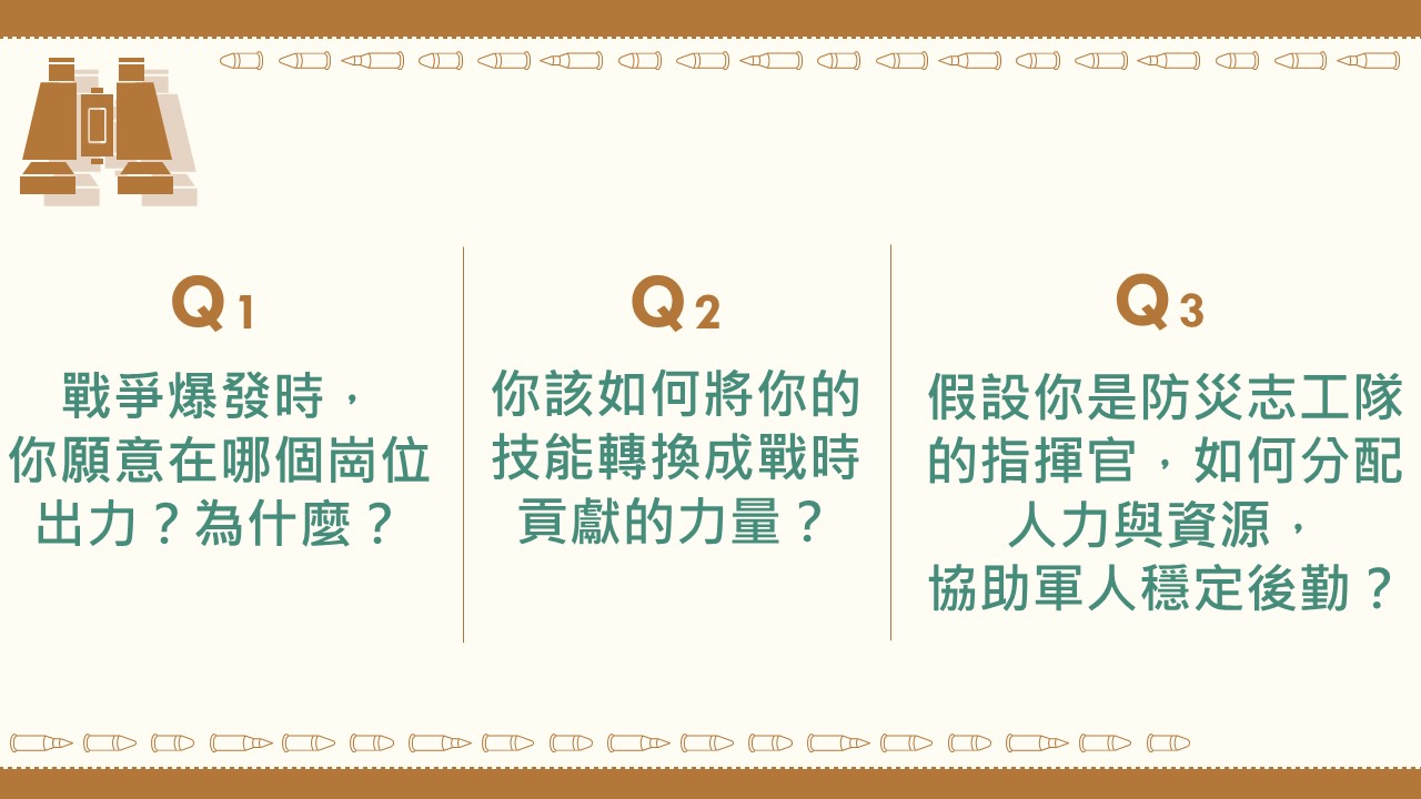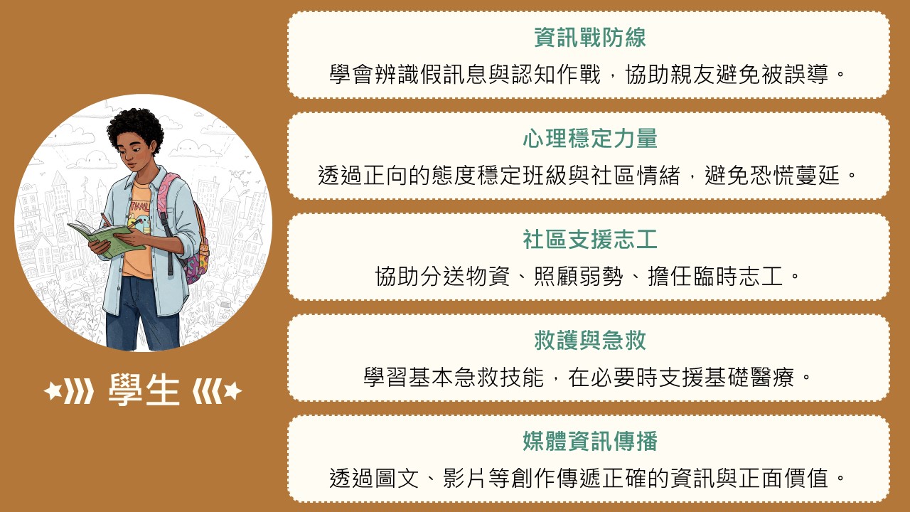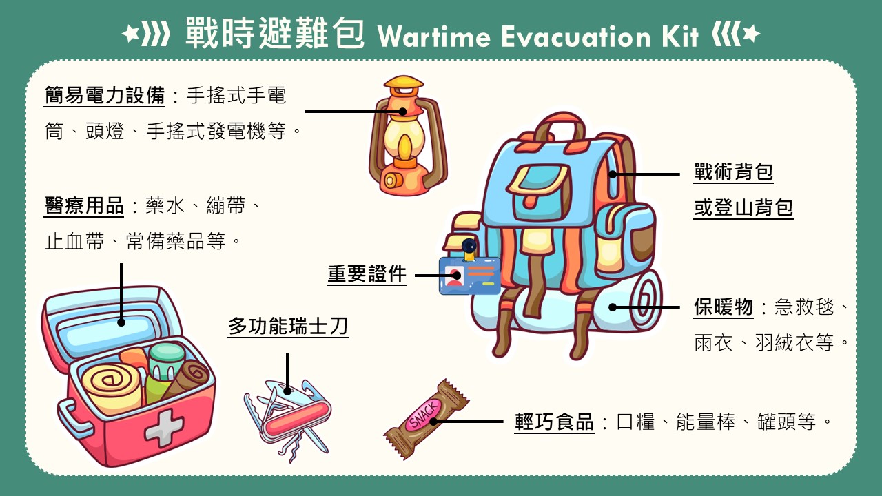 發佈日期:114/05/05 搭配科目:國防 搭配範圍:防衛動員 當警報來襲,我們只有3 ~ 5分鐘可以做出應變,如果能夠事先演練、準備妥當,就可以提升保命的機會。戰爭時該如何避難?該如何成為全民防衛的一環?