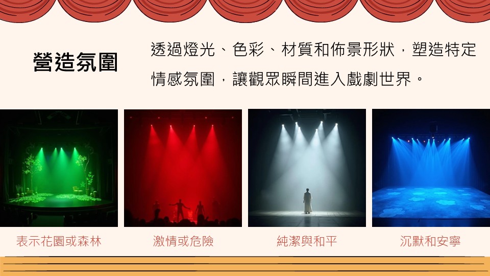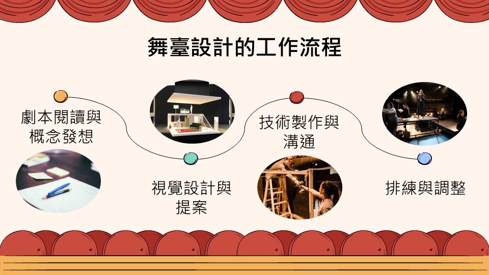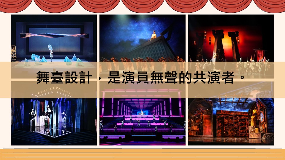 發佈日期:114/05/15 搭配科目:表演藝術、音樂 搭配範圍:劇場實作、藝文參與 這份簡報將帶你穿越舞臺背後的世界,看見舞臺設計如何讓劇情更立體、角色更生動、觀眾更投入。想成為更懂戲、更會演、更會看的人?從認識舞臺設計開始!