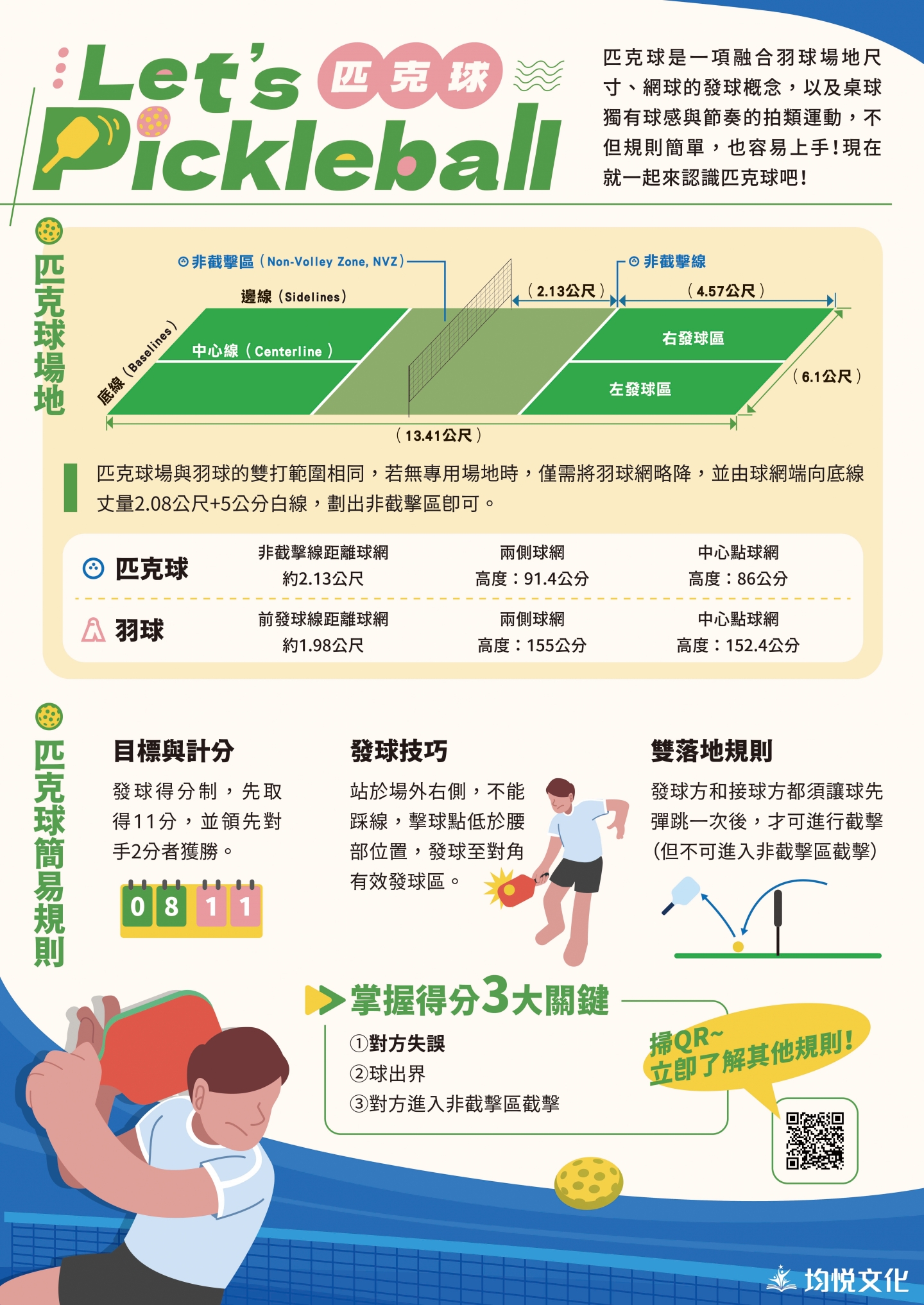 匹克球是一項融合羽球與網球概念的新運動,不但規則簡單,也不分年齡容易上手!現在就一起Let's Pickleball!