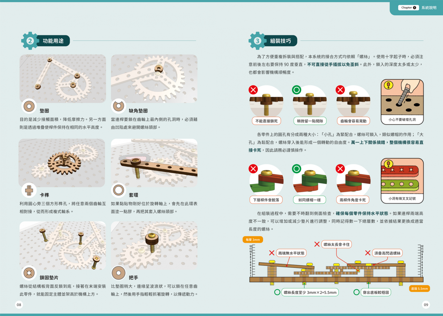 本書將針對組裝過程更加詳細說明,從畫面的設計安排到齒輪機構的運用,配合書中豐富的影音支援,深入創意無限的機構世界!