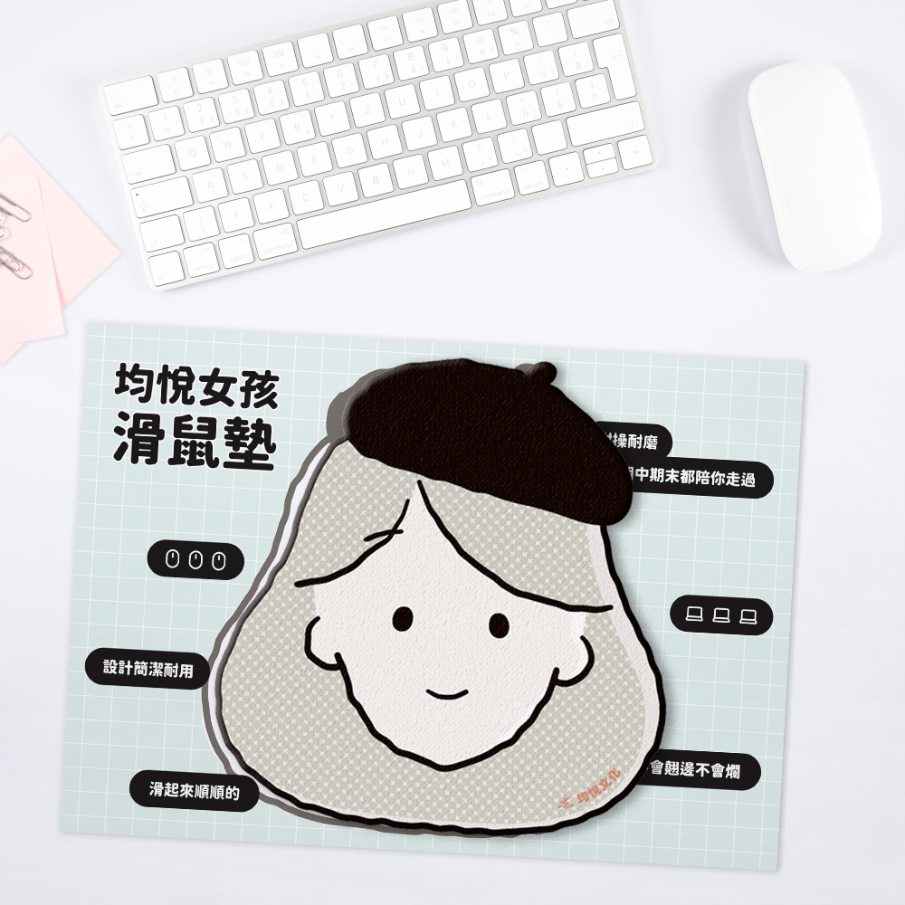 【均悅女孩】質感滑鼠墊:靈感不卡關,陪你戰勝期中期末! 公司超人氣吉祥物「均悅女孩」化身靈感夥伴! 簡筆線條搭配俏皮畫家帽,簡潔設計展現純粹美感。 採用高效能耐磨材質,手感滑順不卡頓。 無論是熬夜改作業還是專注查資料, 就讓「均悅女孩」在手邊為你加油打氣,成為你桌上最耐操、最貼心的最強戰友! PS. 數量有限,發完為止,有興趣的教師們可主動聯繫當區業務取得喔!