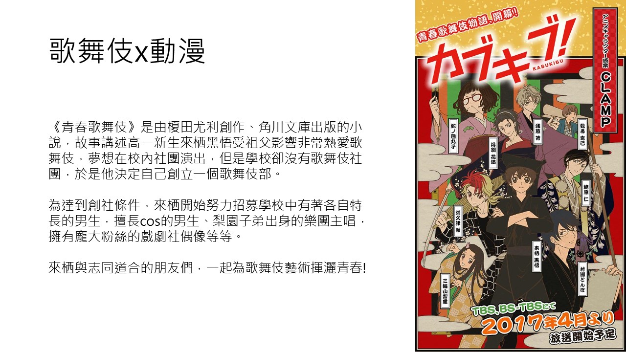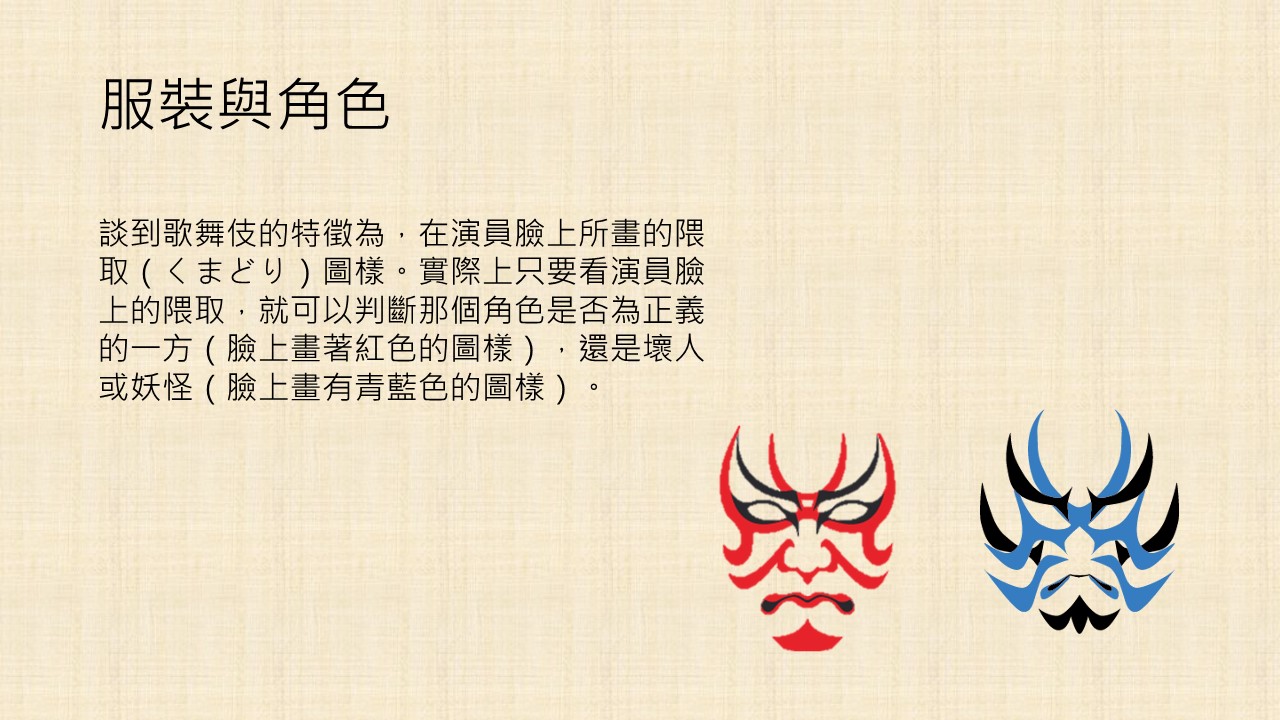 發佈日期:112/02/01 搭配科目:音樂 搭配範圍:日韓音樂文化 作為日本的非物質文化遺產之一,歌舞伎在日本社會地位相當高,且不論男女性角色都是由男性出演,因此演員顏值都相當高,不乏歌舞伎出身的演員或模特,因此非常受到日本民眾的喜愛!