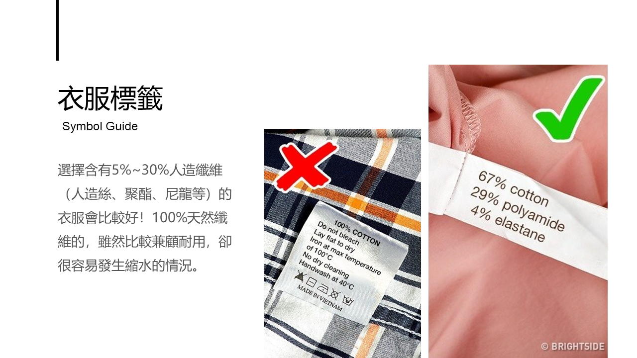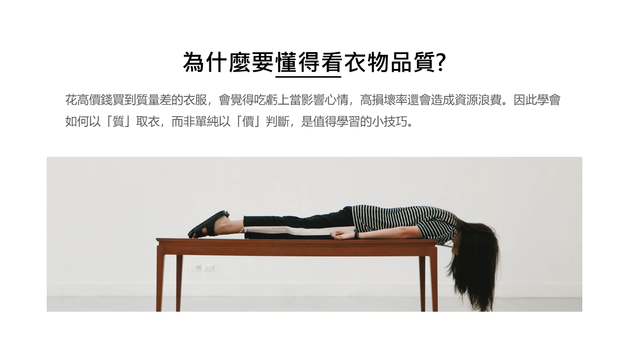 發佈日期:111/12/01 搭配科目:家政 搭配範圍:萬中選衣 買衣服最怕花高價錢買到低質量的衣服,除了造成穿著不適,還可能會影響心情,並造成金錢的浪費。所以如何懂得看衣服的好壞,是你我都值得學習的小技巧喔!