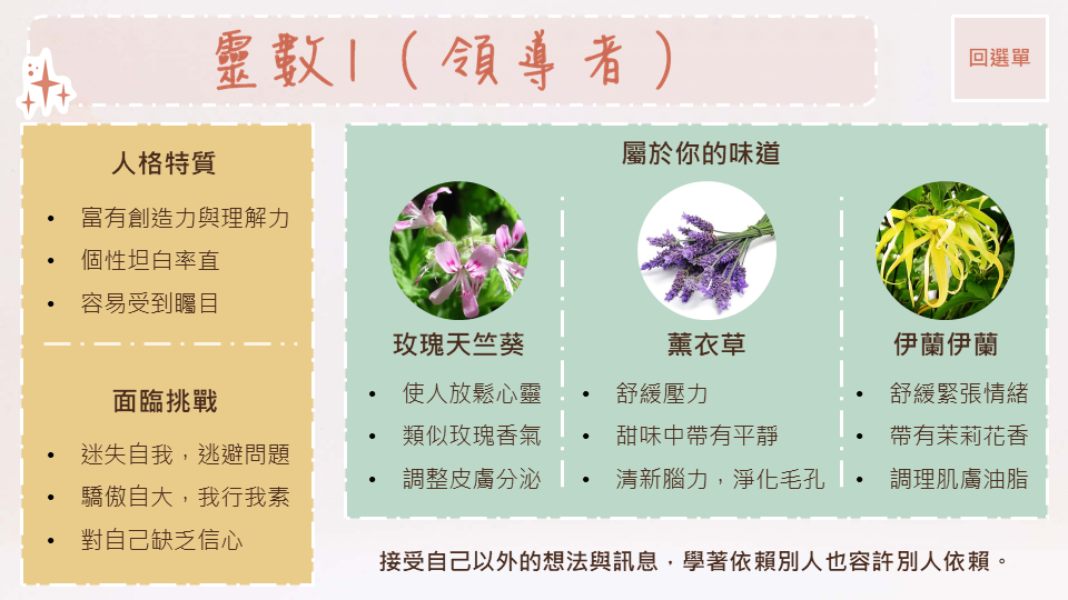 發佈日期:112/03/01 搭配科目:健護、生命 搭配範圍:健康心理、靈性休養 生命靈數是塔羅、紫微斗數等命理學的基礎,藉由數字認識自己並發揮天賦,搭配精油能夠療癒身心,並調整自己所缺乏的特質。一起來看看如何運用精油提升自己!