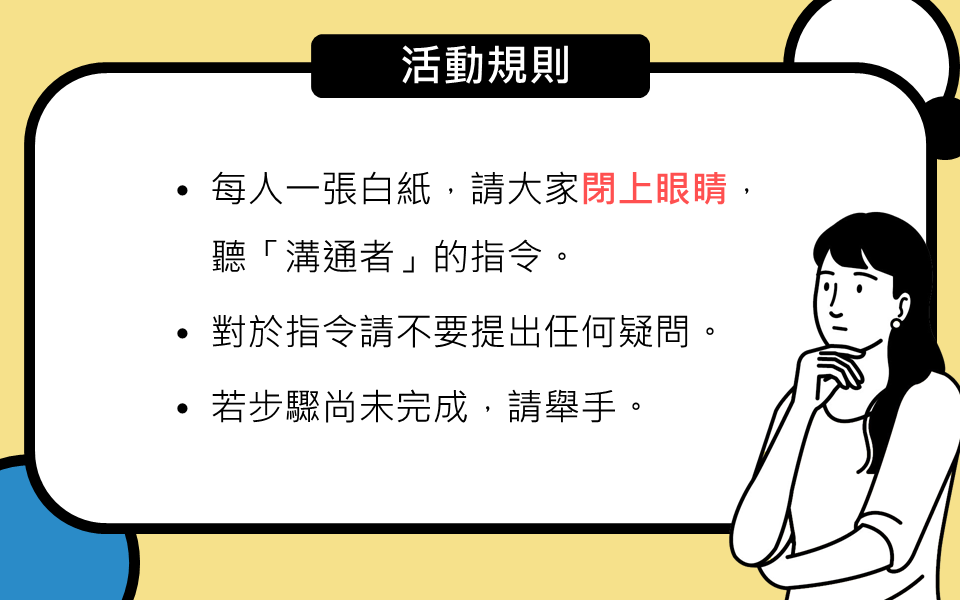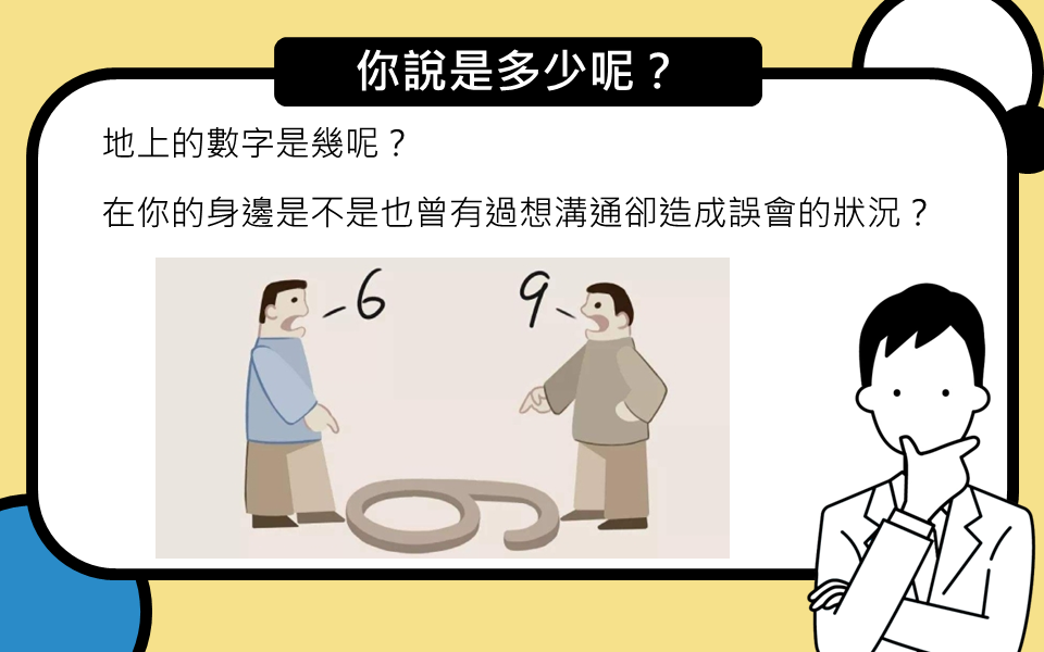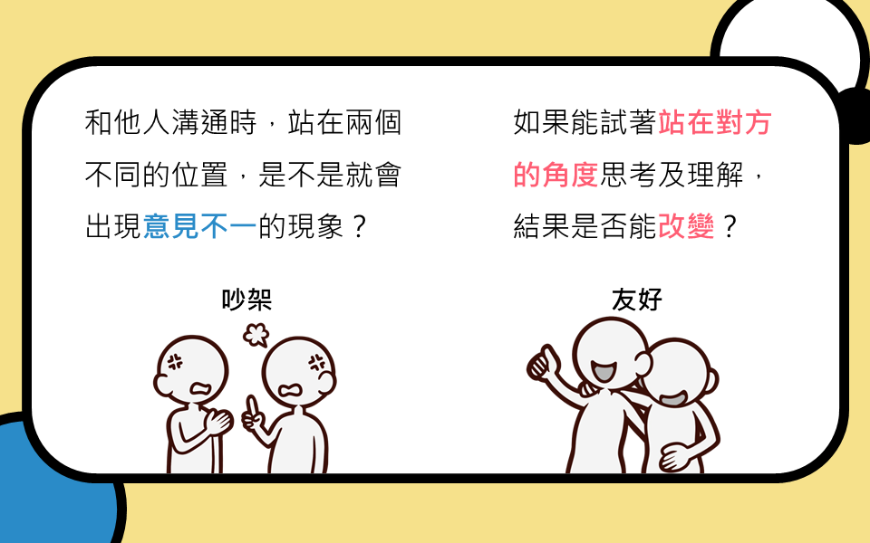 發佈日期:112/03/01 搭配科目:健護、生命 搭配範圍:心理健康、人學探索 立場不同、看事情的角度不同,在溝通上都有可能造成彼此誤會的狀況。透過簡單的前導活動讓學生們親身體驗:同樣一句話,不同的人會有不同的理解方式,進而引導學生培養同理心的重要性。