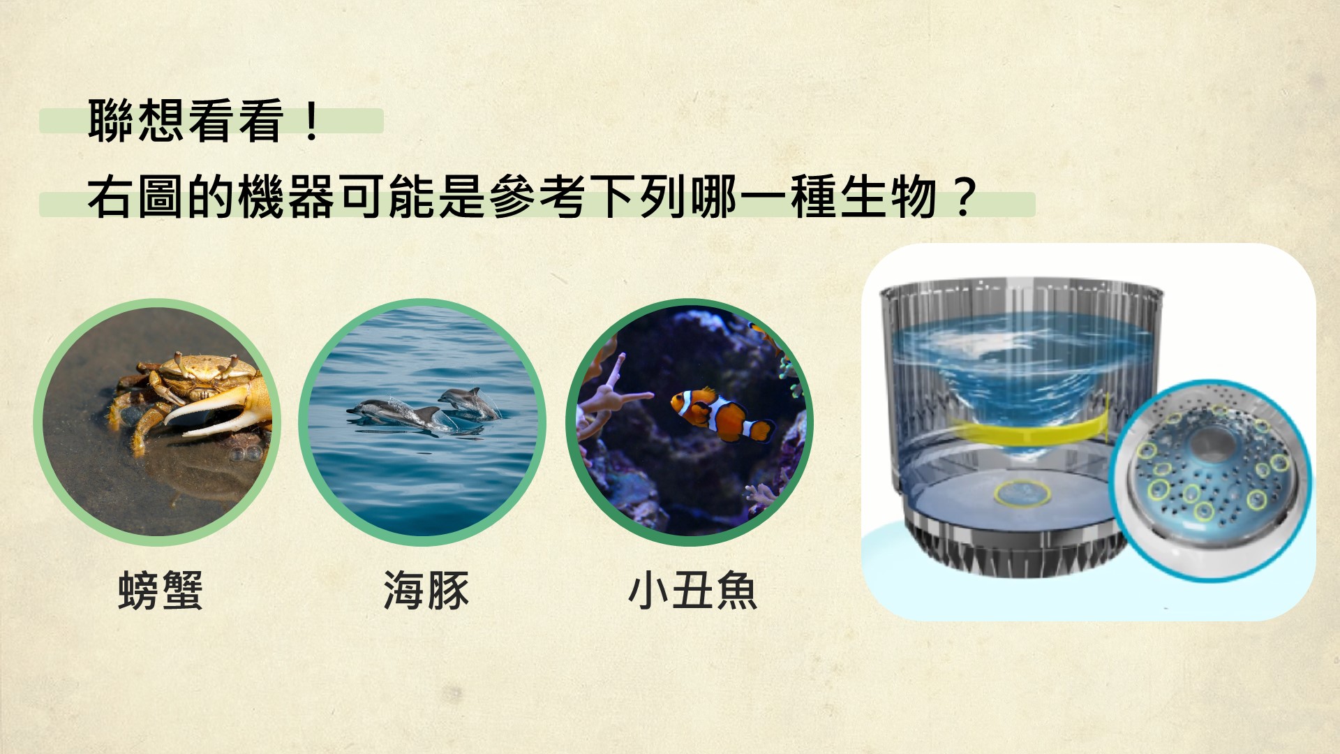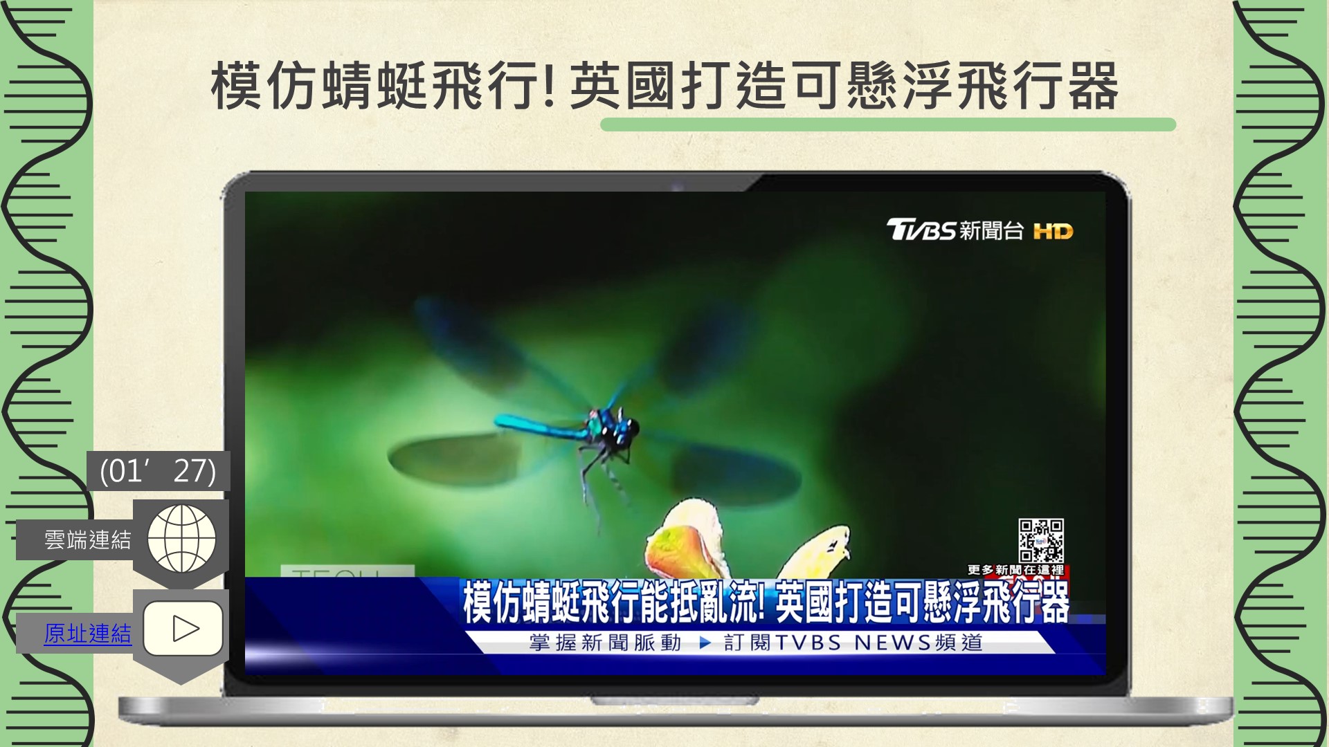發佈日期:112/05/05 搭配科目:生活科技 搭配範圍:仿生科技、課外延伸 自古以來,自然界就是人類各種科學技術原理與重大發明的泉源,近年來台灣也不斷推動仿生設計競賽與世界接軌,就讓我們快速帶你了解何謂仿生科技~