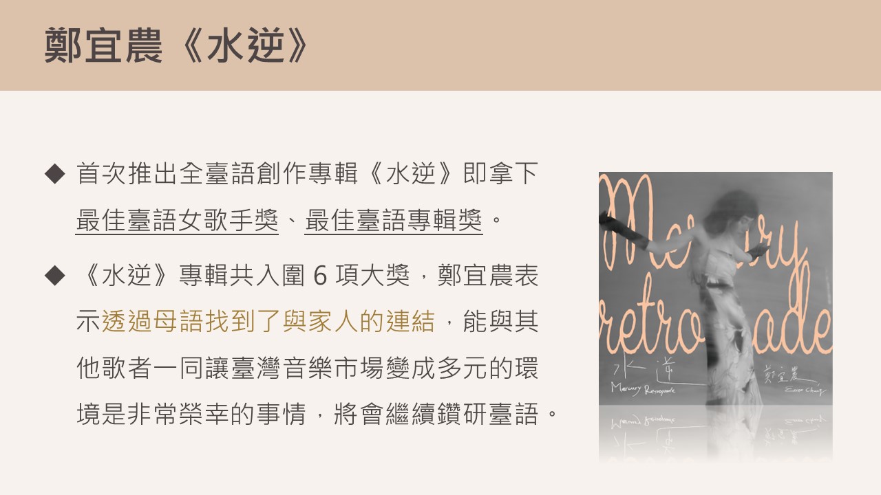母語創作正流行!用金曲獎項帶你看優秀得獎作品,了解新世代創作歌手選擇母語的理由,不只要把家的回憶找回來,也要讓語言永流傳!