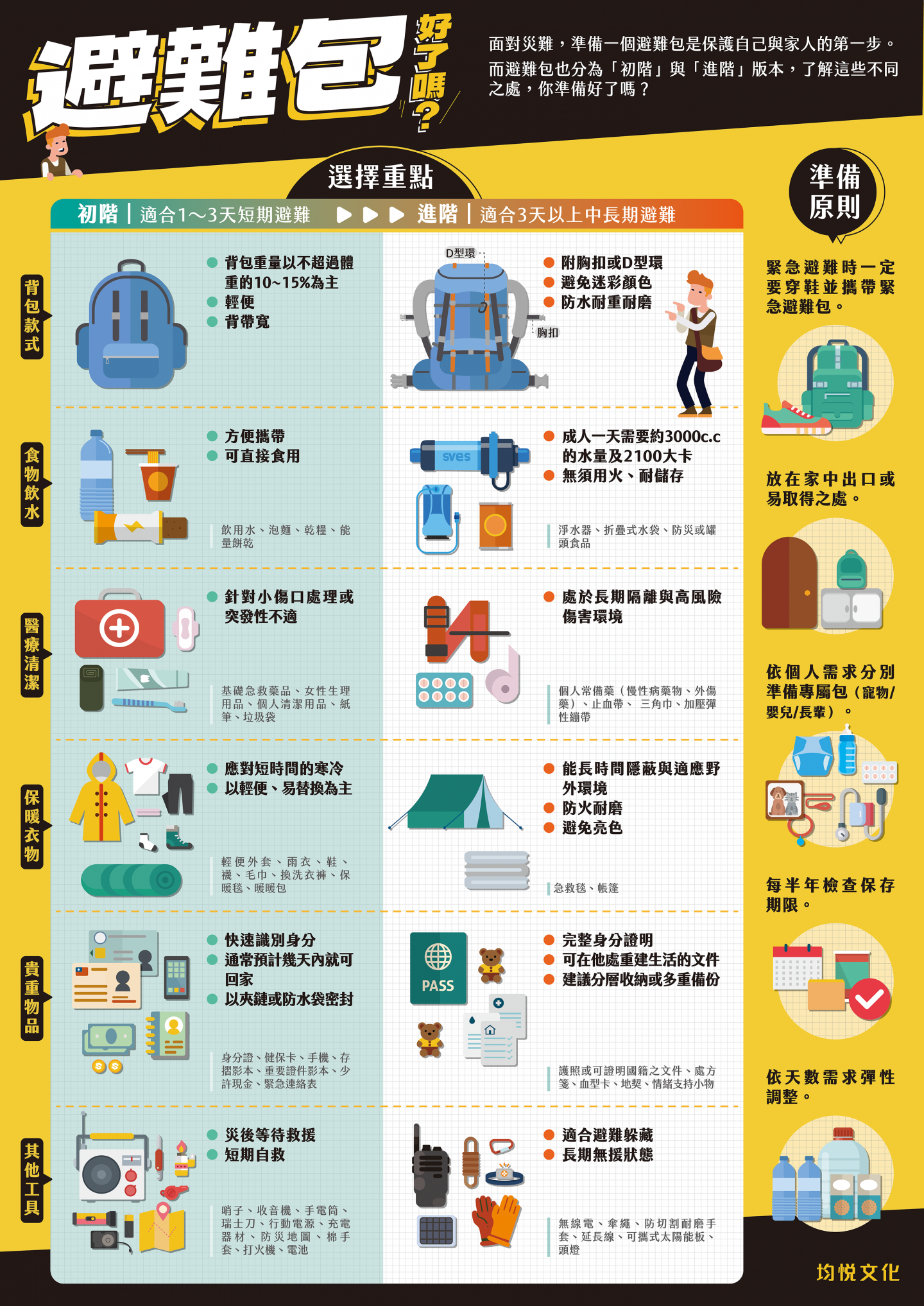 而避難包也有分初階短期以及進階長期的用途,了解這些不同之處並開始進行事前準備吧!