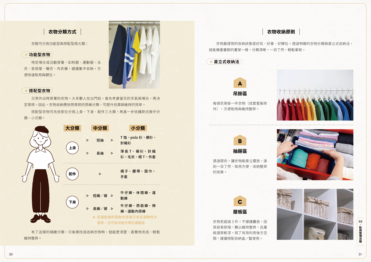 ※以下內容建議以電腦觀看,畫面較為美觀唷! 整理生活誌——整理.前進 整理環境,也整理心境! 由職業整理師團隊撰寫 一起體驗讓生活更自在的整理魔法 本書從規劃理想環境開始,帶你一步步找出適合自己的整理方式, 並詳細拆解各類衣物、文具、小物等物品的收納技巧, 讓忙碌的生活也能井然有序,自在不慌亂。
