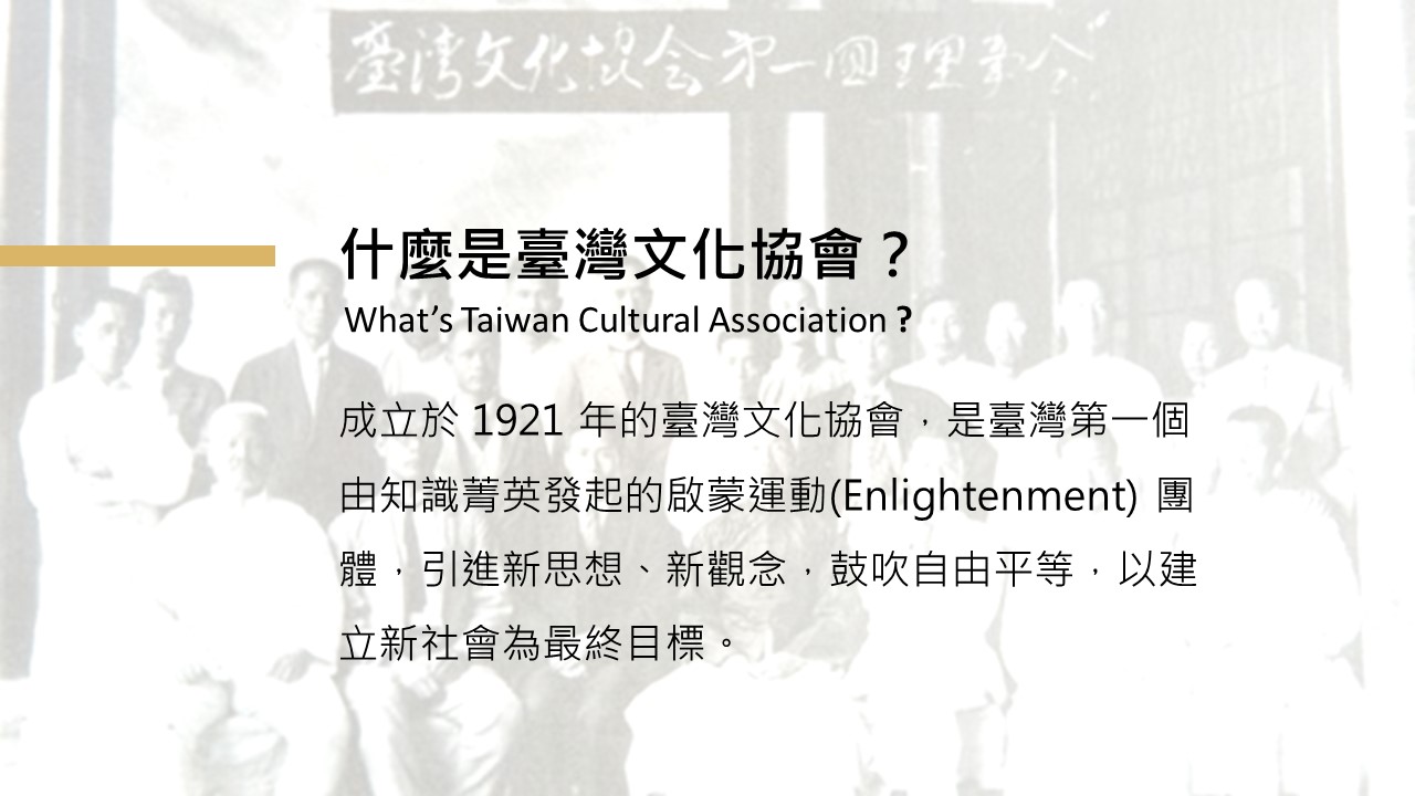 發佈日期:110/11/03 搭配科目:美術 搭配範圍:臺灣美術史 2021年10月為臺灣新文化協會成立一百周年,為傳承新文化運動精神,文化部舉辦一系列的相關活動。這裡以北美館的特展為主題,從美術史的角度出發,認識1921年臺灣藝術家的美術翻轉力!