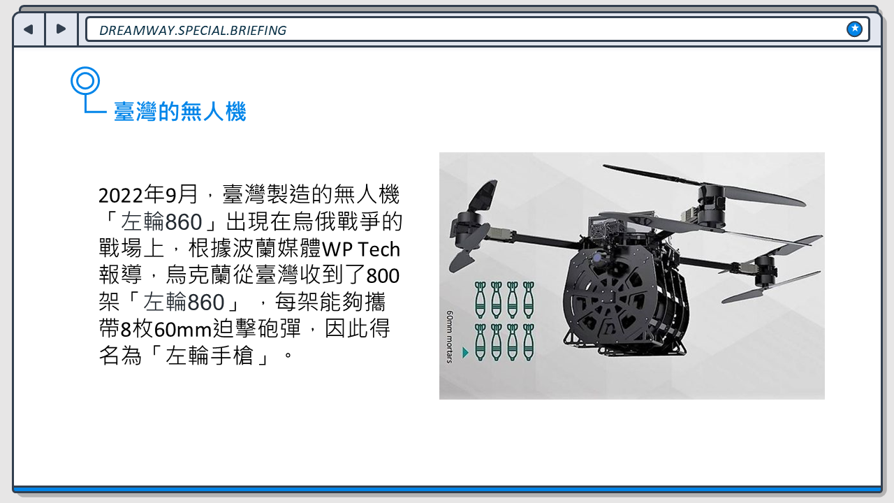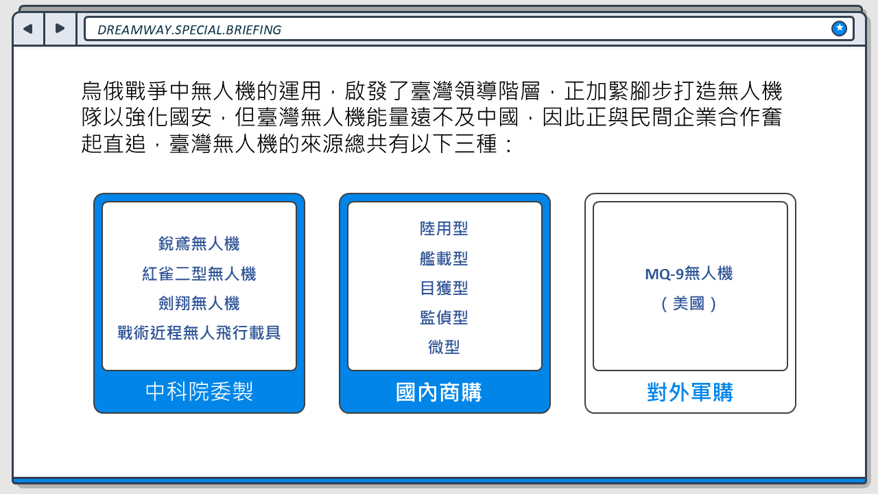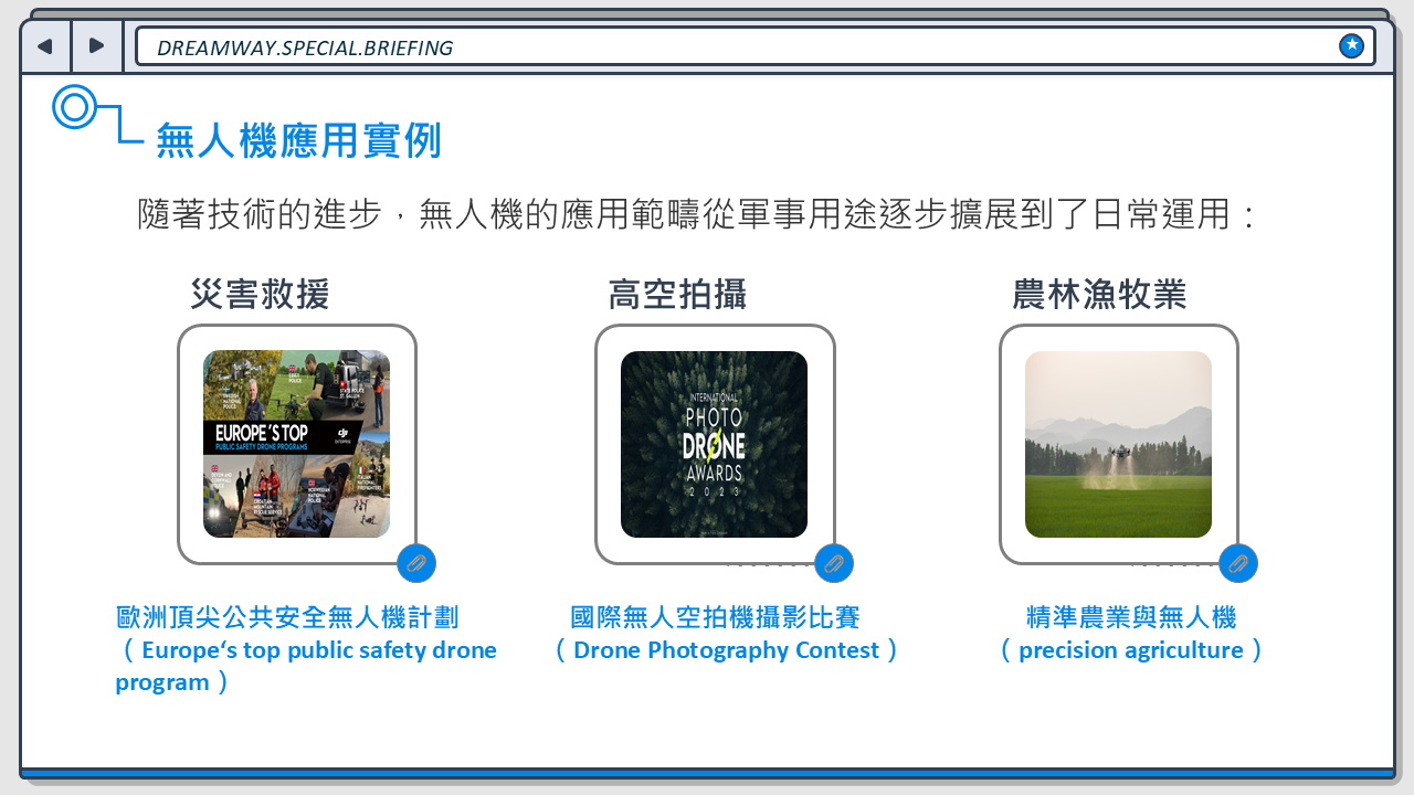 發佈日期:113/12/05 搭配科目:國防 搭配範圍:國防科技 自烏俄戰爭以來,無人機在戰場上的運用愈發頻繁,它被稱為戰場上的千里眼,加快了殺傷鏈的進程,不過除了戰場,它也有許多運用方式,一起來認識一下吧!